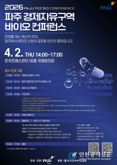[인천광역신문] 관리자 기자 | 파주시는 오는 4월 2일 14시, 서울 중구 한국프레스센터 국제회의장에서 녪파주 경제자유구역 바이오 컨퍼런스’를 개최한다.