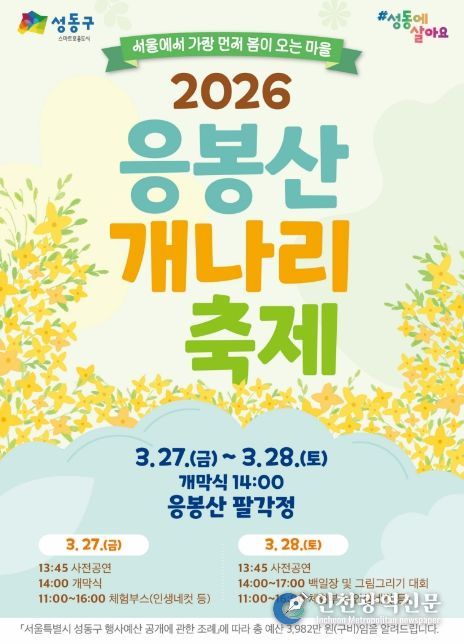[인천광역신문] 관리자 기자 | 서울 성동구는 오는 3월 27일부터 28일까지 이틀간 봄의 기운을 가득 품은 응봉산에서 ‘2026년 응봉산 개나리 축제’를 개최한다.