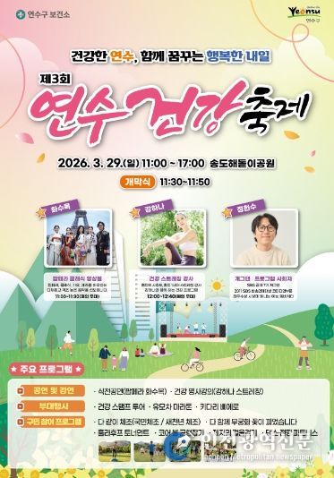 [인천광역신문] 관리자 기자 | 연수구는 오는 3월 29일 송도해돋이공원 잔디광장 일대에서 구민 누구나 참여하고 즐길 수 있는 ‘제3회 연수 건강축제’를 개최한다.