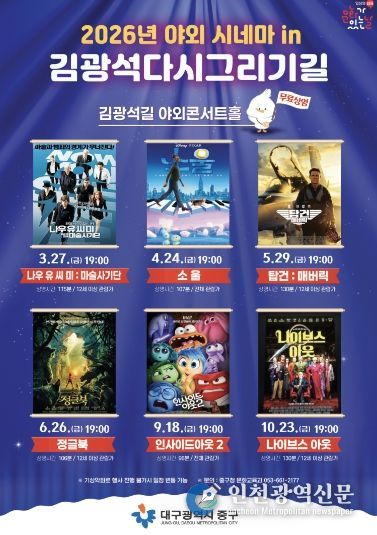 [인천광역신문] 관리자 기자 | 대구 중구는 오는 3월 27일부터 김광석길 야외콘서트홀에서 2026년 ‘야외 시네마 in 김광석다시그리기길’을 운영한다.