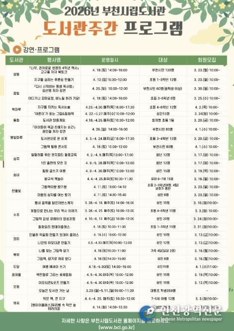 [인천광역신문] 관리자 기자 | 부천시는 4월 ‘도서관의 날’과 제62회 도서관 주간을 맞아 ‘도서관 속 작은 펼침, 세상을 여는 큰 열림’을 슬로건으로 다양한 행사와 프로그램을 운영한다.