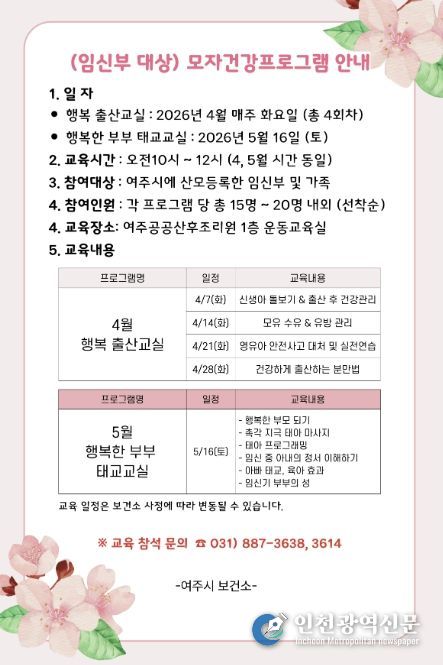 [인천광역신문] 관리자 기자 | 여주시 건강증진과는 관내 임산부가 출산에 대한 전반적인 지식과 기술을 습득하여 건강하고 행복한 출산이 되도록 2026년도 상반기 '출산준비교실' 운영한다.