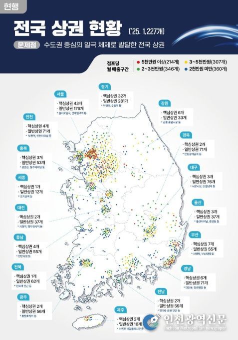 전국 상권이 수도권 중심의 일극 체제로 고착화됨에 따라 지방상권의 쇠퇴가 심화되고 있다. 전국 상위 10%에 해당하는 핵심상권(123개)의 3분의 2가 수도권(79개)에 소재하고 있으며, 수도권-지방 간의 유사한 인구분포에도 수도권 상권의 매출이 지방 상권의 4배로 소비행위가 수도권을 중심으로 발생하고 있다.
