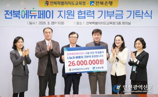 [인천광역신문] 관리자 기자 | 전북에듀페이카드 운영사인 전북은행이 전북특별자치도교육청에 장학금 2,600만 원을 기부했다.