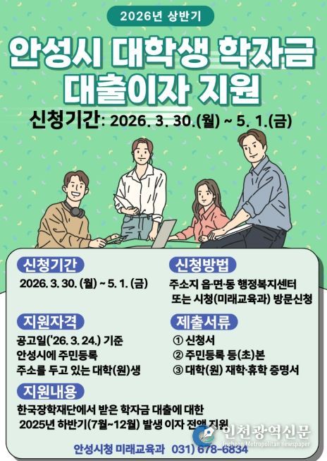 [인천광역신문] 관리자 기자 | 안성시는 대학생 및 대학원생들의 교육비 부담을 덜어주기 위해 ‘2026년 상반기 대학생 학자금 대출이자 지원사업’을 시행한다고 밝혔다.