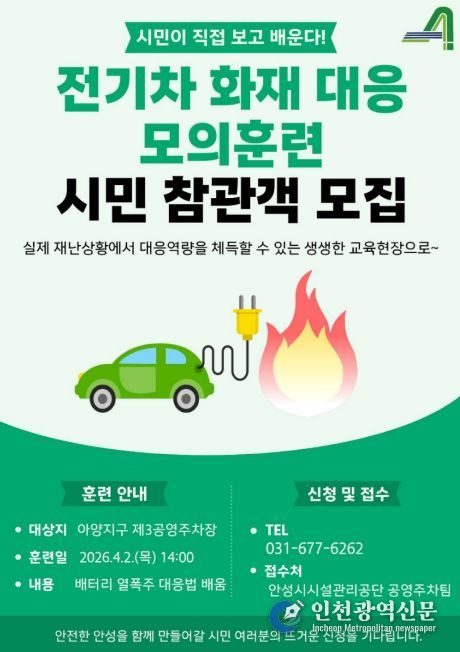 [인천광역신문] 관리자 기자 | 안성시시설관리공단은 오는 4월 2일 목요일 오후2시 안성시 옥산동 소재 아양지구 제3공영주차장에서 ‘시민과 함께하는 2026년 재난대응 모의훈련’을 실시한다고 밝혔다.
