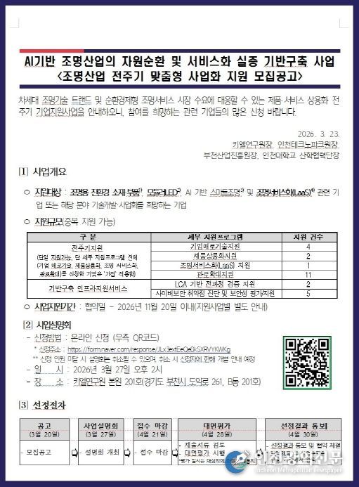 [인천광역신문] 관리자 기자 | 인천테크노파크(인천TP)는 산업통상부의 ‘AI 기반 조명산업의 자원순환 및 서비스화 실증 기반구축사업’의 일환으로, 조명기업 대상 전주기 사업화 지원 프로그램에 참여할 기업을 오는 4월 21일까지 모집한다고 밝혔다.