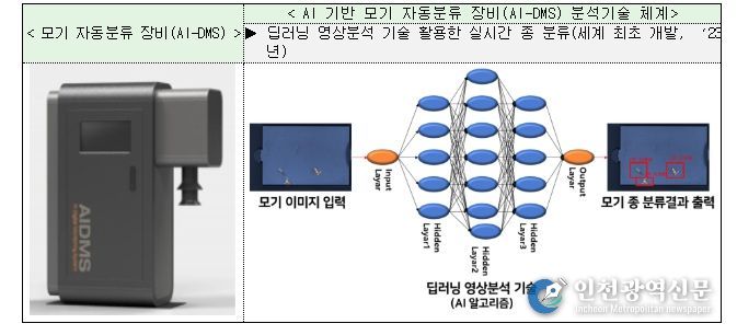연구원은 이러한 문제를 극복하고자 모기 유입을 자동으로 감지하고 딥러닝 영상분석 기술로 종류와 개체 수를 즉시 판별하는 인공지능(AI) 기반 모기 자동 감시장비(AI-DMS)를 도입한다.