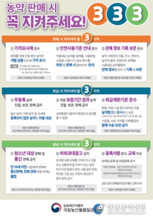 [인천광역신문] 관리자 기자 | 국립농산물품질관리원은 4월 1일부터 9월 30일까지 전국에 등록된 전체 농약판매업체를 대상으로 지방자치단체와 함께 농약 유통 점검을 실시한다고 밝혔다.