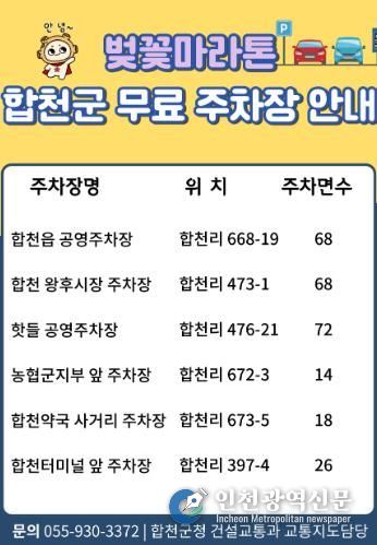 주차장 무료개방과 관련한 자세한 사항은 합천군 건설교통과 교통지도담당으로 문의하면 된다.