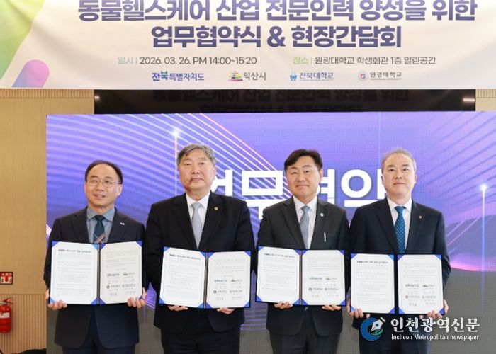 [인천광역신문] 관리자 기자 | 김관영 전북특별자치도지사가 26일 원광대학교에서 ‘동물헬스케어 전문인력 양성을 위한 현장간담회’를 갖고, 전북대학교·원광대학교·익산시와 함께 산·학·관 협력 기반 구축을 위한 업무협약을 체결했다.