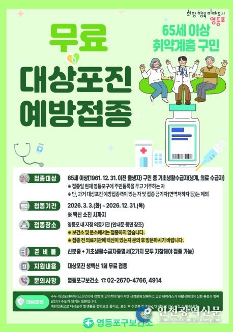 [인천광역신문] 관리자 기자 | 영등포구가 65세 이상 취약계층 어르신을 대상으로 대상포진 무료 예방접종을 지원해 경제적 부담을 덜고 면역력 강화에 나선다.
