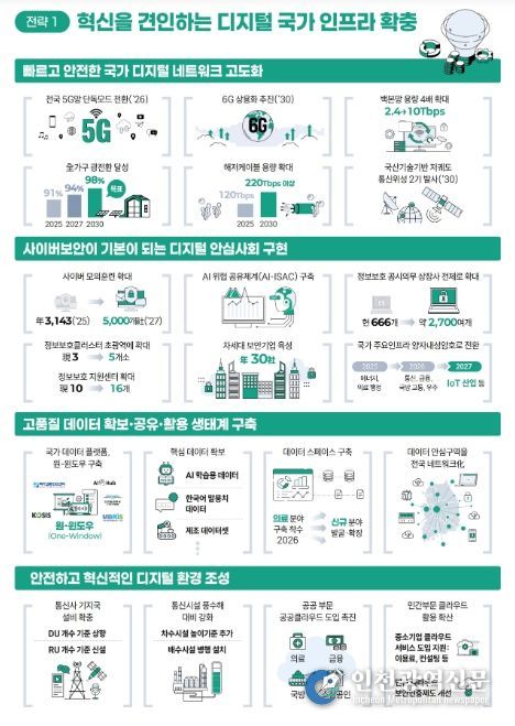 이에 대응하여 과학기술정보통신부(부총리 겸 과기정통부 장관 배경훈, 이하 ‘과기정통부’)는 관계부처와 합동으로'제4차 정보 통신 진흥 및 융합 활성화 기본계획 및 제8차 지능정보사회 종합계획(’26~’28)'을 수립하고, ▲①연결망(네트워크) 고도화 ‧ 정보 보호 강화 ‧ 데이터 생태계 구축 등 국가 디지털 기반 시설(인프라) 확충 ▲②디지털 핵심기술 확보 ‧ 인재 양성 등 디지털 역량 강화 ▲③산업 ‧ 지역 등 전방위적인 국가 지능 정보화 고도화 ▲④디지털 격차 해소 및 모두의 통신 ‧ 디지털 서비스 보장 등 디지털 포용환경 조성을 핵심과제로 추진한다.