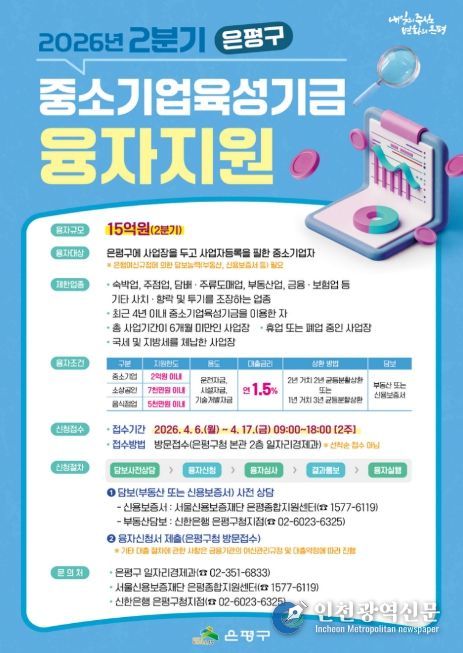 [인천광역신문] 관리자 기자 | 서울 은평구는 관내 중소기업과 소상공인의 경영 안정을 위해 15억 원 규모의 2026년 2분기 중소기업육성기금 융자를 시행한다고 밝혔다.