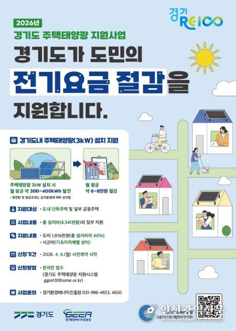 [인천광역신문] 관리자 기자 | 경기도가 주택태양광 설치비의 약 60%를 지원하는 ‘2026 경기도 주택태양광 지원사업’ 참여자를 모집한다고 30일 밝혔다. 모집규모는 총 1,520가구다.