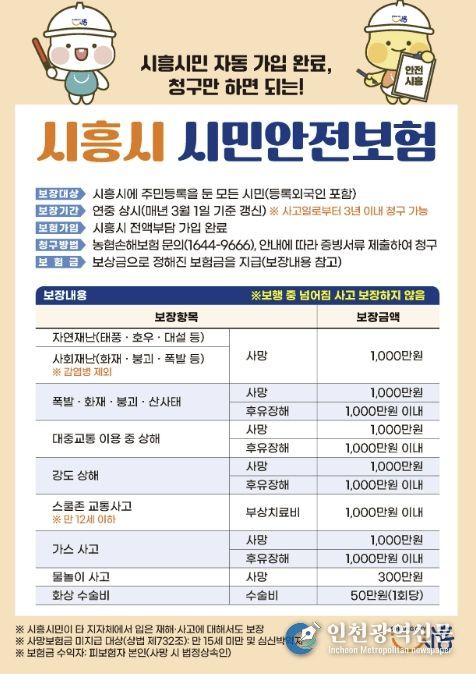 [인천광역신문] 관리자 기자 | 시흥시는 각종 재난과 사고로부터 피해를 본 시민에 대해 생활 안정을 지원하기 위해 ‘시흥시 시민안전보험’을 연중 운영하고 있다.