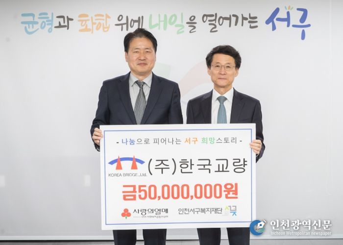 [인천광역신문] 관리자 기자 | ㈜한국교량은 인천서구복지재단에 지역 내 어려운 이웃을 위해 5천만 원을 지정기탁했다.