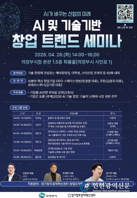 [인천광역신문] 관리자 기자 | 의정부시는 ‘2026 첨단산업 스케일업’ 사업의 일환으로 4월 인뎁스(In-depth) 네트워킹과 AI‧기술기반 창업 트렌드 세미나를 개최하고 참여 기업과 시민을 모집한다.