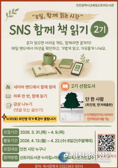 [인천광역신문] 관리자 기자 | 인천광역시교육청신트리도서관은 시민의 일상 속 독서 활성화를 위하여, 3월 31일부터 온라인 참여형 독서 프로그램 ‘SNS 함께 책 읽기’ 2기 참여자를 모집한다.