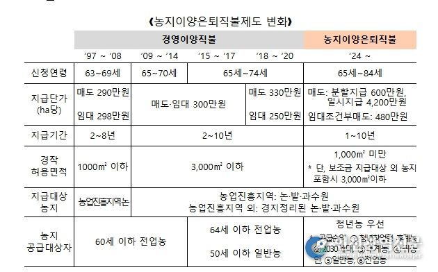 농식품부 강동윤 농촌소득에너지정책국장은 “이번 제도 개선은 고령 농업인의 현실적인 영농 여건을 반영한 것”이라며, “앞으로도 안정적인 노후소득 보장과 함께 원활한 영농 세대교체가 이루어질 수 있도록 제도를 지속적으로 보완해 나가겠다”고 밝혔다.