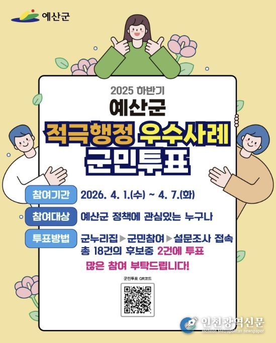 [인천광역신문] 관리자 기자 | 예산군은 2025년 하반기 적극행정 우수공무원 선발을 위해 4월 1일부터 7일까지 7일간 온라인 군민투표를 실시한다고 밝혔다.