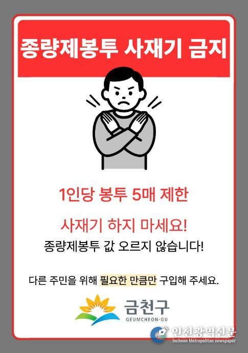 [인천광역신문] 관리자 기자 | 금천구는 최근 종량제봉투 수급 불안으로 사재기 조짐이 일어남에 따라 주민들에게 과도한 구매 자제를 당부했다고 밝혔다.