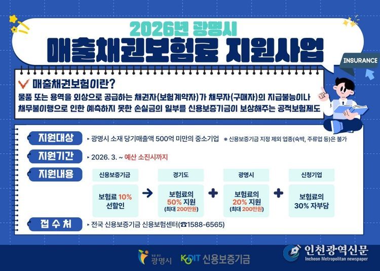 지원 대상은 광명시에 본사 또는 주사업장을 둔 당기 매출액 500억 원 미만 중소기업이다. 보험에 가입한 기업은 추후 거래처로부터 대금을 회수하지 못할 경우 손실금의 최대 80%까지 보상받을 수 있다.