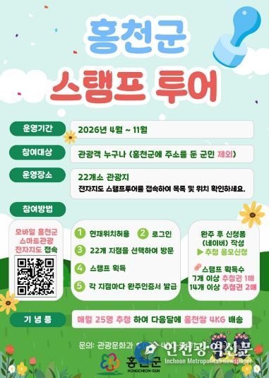 [인천광역신문] 관리자 기자 | 홍천군이 봄철 관광객 맏이에 나선다. 홍천군은 4월부터 11월까지 관광객을 대상으로 ‘2026 홍천군 도장 찍기 여행(스탬프 투어)’를 운영한다고 밝혔다.