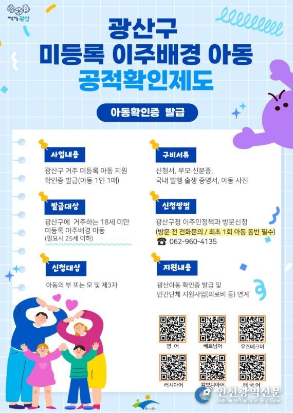 [인천광역신문] 관리자 기자 | 광주 광산구가 광주 최초로 미등록 이주배경 아동의 기본권 보호를 위한 공적 확인제도를 시행한다.