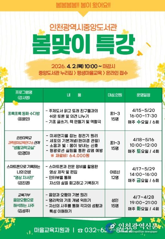 [인천광역신문] 관리자 기자 | 인천광역시교육청중앙도서관은 4월부터 지역주민의 배움과 여가를 지원하기 위하여, 다양한 연령층을 대상으로 ‘봄맞이 특강’을 운영한다.