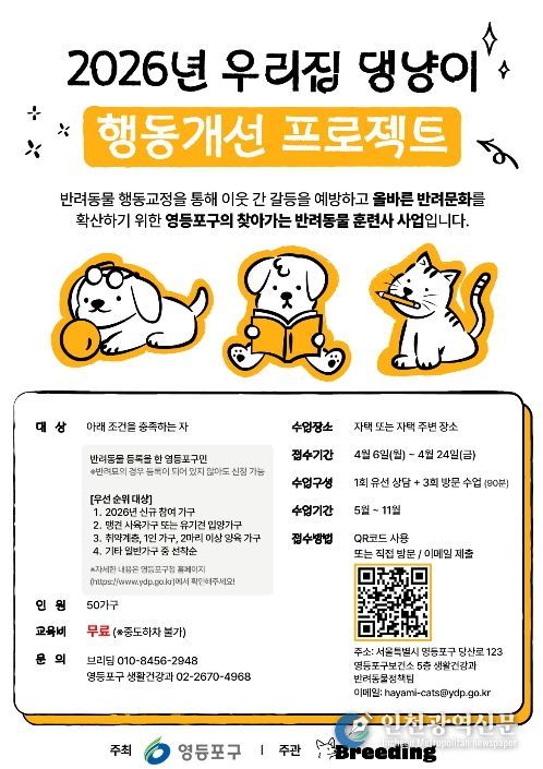 [인천광역신문] 관리자 기자 | 영등포구가 반려동물의 문제행동으로 어려움을 겪고 있는 구민들을 지원하기 위해 찾아가는 반려동물 훈련 사업인 ‘우리집 댕냥이 행동개선 프로젝트’를 운영한다고 밝혔다.