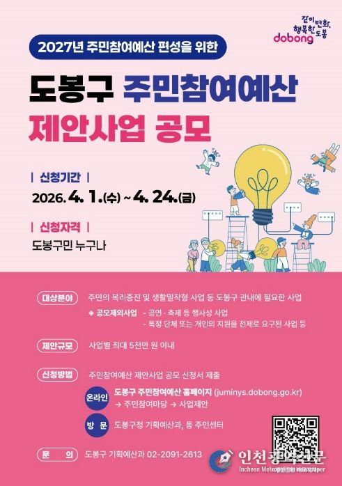 [인천광역신문] 관리자 기자 | 서울 도봉구가 2027년 예산편성을 위한 주민참여예산 제안사업을 공모한다.