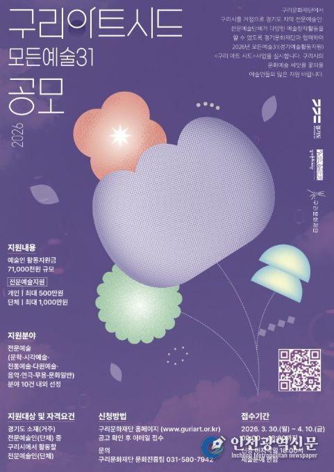 [인천광역신문] 관리자 기자 | (재)구리문화재단은 구리 시민의 문화 향유 기회를 확대하고 지역 예술 생태계를 활성화하기 위한 2026년 예술인지원 사업 ‘구리아트시드(모든 예술 31)’ 공모를 오는 4월 10일 오후 6시까지 접수한다고 밝혔다.
