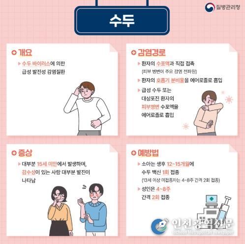 [인천광역신문] 관리자 기자 | 대구 북구보건소는 봄철 기온 상승과 함께 야외 활동 및 단체생활이 늘어나는 4월을 맞아, 수두와 유행성이하선염 발생 증가가 예상됨에 따라 시민들의 각별한 주의를 당부했다.