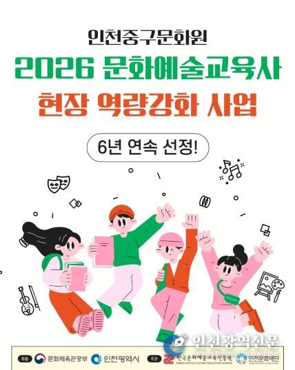 [인천광역신문] 관리자 기자 | 인천중구문화원(원장 박봉주)이 문화체육관광부와 인천광역시가 주최하고, 인천문화재단 인천문화예술교육지원센터와 한국문화예술교육진흥원이 주관하는 '2026 문화예술교육사 현장 역량강화 사업(인천)'에 6년 연속 선정되는 쾌거를 달성했다.