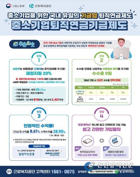 이와 함께 최근'근로자퇴직급여보장법'개정에 따라 오는 7월 1일부터는 가입 대상이 기존 30인 이하 사업장에서 50인 미만 사업장으로 확대되고 2027년부터는 100인 미만 사업장까지 단계적으로 확대될 예정이다.