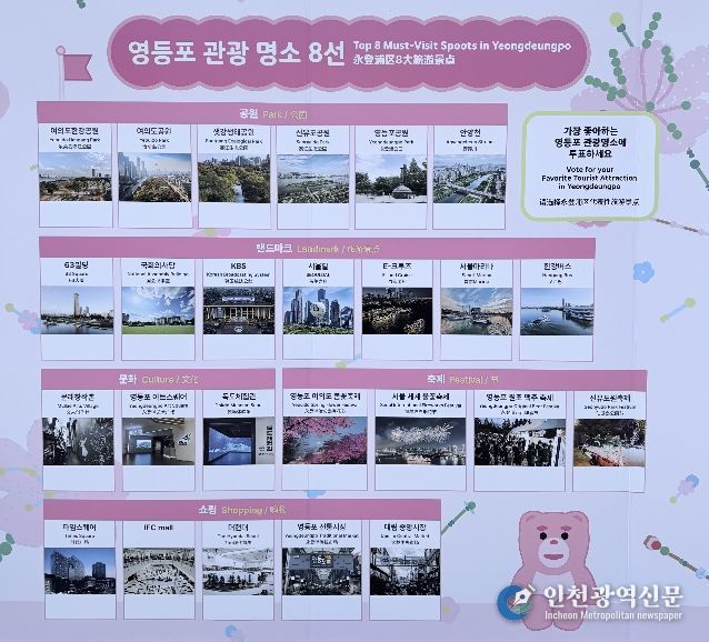 [인천광역신문] 최예준 기자 | 영등포구가 지역을 대표하는 관광명소를 전 국민 참여로 선정하는 ‘영등포 관광명소 8선(Yeongdeungpo 8 Picks)’ 사업을 추진하며 관광 브랜드 강화에 나선다.