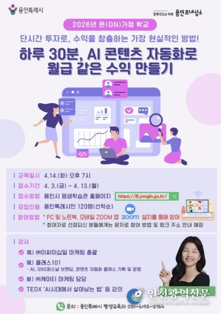 [인천광역신문] 최예준 기자 | 용인특례시는 오는 13일까지 ‘하루 20분, AI 콘텐츠 자동화로 월급 같은 수익 만들기’를 주제로 한 ‘2026년 온가정학교’ 온라인 특강 수강생을 모집한다고 3일 밝혔다.