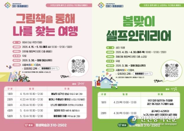 선정된 프로그램은 4월부터 순차적으로 개강해 본격 운영에 들어간다. 주요 강좌로는 대야동에서 ‘그림책을 통해 나를 찾는 여행’, 정왕3동에서 ‘봄맞이 셀프 인테리어’ 등이 진행되며, 동동배움터는 올해 말까지 연중 운영된다.