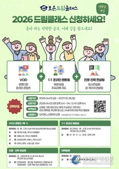 [인천광역신문] 최예준 기자 | 충북 보은군은 교육발전특구사업과 연계해 도농 간 교육 격차를 해소하고 지역인재를 양성하기 위한 ‘2026년 보은군 학습증진사업(보은 드림 클래스)’을 본격 추진한다고 3일 밝혔다.