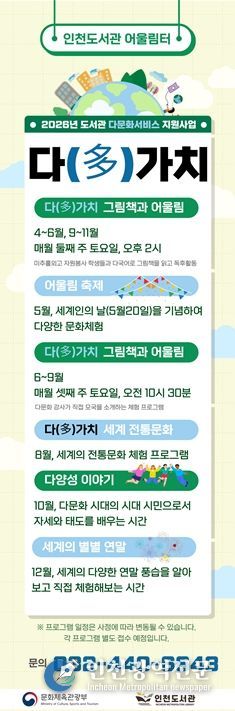 [인천광역신문] 최예준 기자 | 인천광역시 인천도서관은 어린이를 대상으로 다양한 문화를 이해하고 존중하는 태도를 기를 수 있도록 2026년 도서관 다문화서비스 지원사업 '다(多)가치'를 운영한다고 밝혔다.