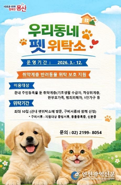 [인천광역신문] 최예준 기자 | 서울 용산구가 경제적 어려움이나 입원 등으로 장기간 집을 비워야 하는 상황에서 반려동물을 돌보지 못하는 취약계층의 부담을 덜기 위해 ‘2026 우리동네 펫 위탁소’ 사업을 추진한다.