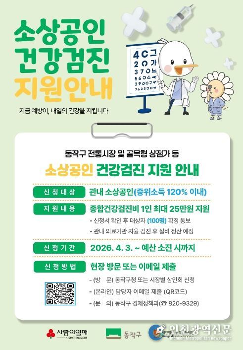 [인천광역신문] 최예준 기자 | 동작구가 경기 둔화 및 물가 상승으로 경영 부담이 커지면서 건강관리에 소홀해지기 쉬운 소상공인을 위해 ‘소상공인 건강검진비 지원사업’을 실시한다고 밝혔다.