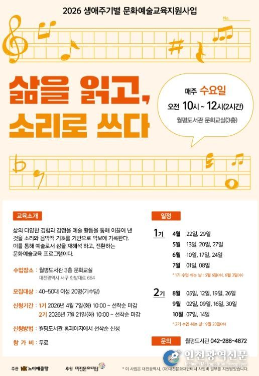 [인천광역신문] 최예준 기자 | 대전 서구 월평도서관은 중장년층 삶의 궤적을 음악과 문장으로 기록하는 문화예술 프로그램‘삶의 읽고, 소리로 쓰다’와‘선율과 문장’을 운영한다.