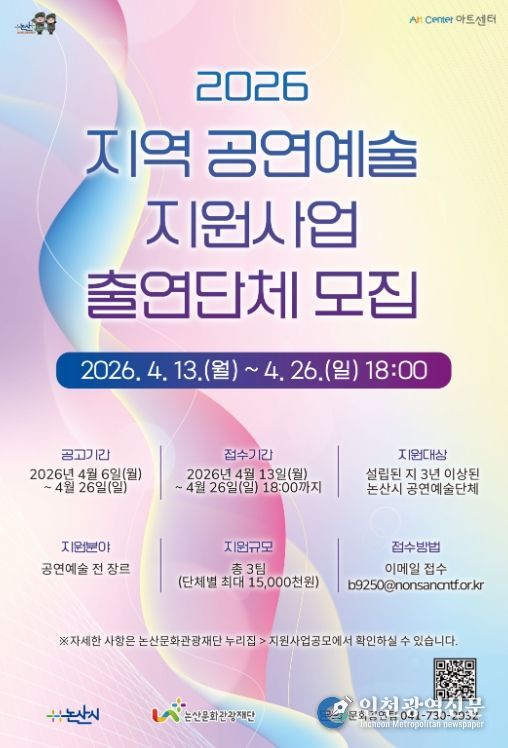 [인천광역신문] 최예준 기자 | (재)논산문화관광재단은 오는 4월 13일부터 4월 26일까지 ‘지역 공연예술 지원사업’ 출연단체 모집 공모를 진행한다.