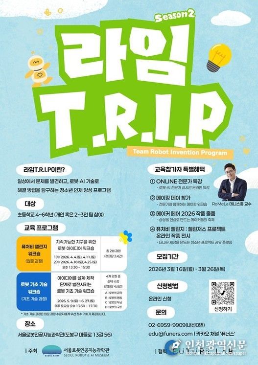 [인천광역신문] 최예준 기자 | 서울로봇인공지능과학관(Seoul Robot & AI Museum, 서울 RAIM)은 청소년과 시민이 로봇·인공지능(AI) 기술을 보다 주체적으로 이해하고 활용할 수 있도록, ‘로봇 발명프로그램’과 특별강연 ‘AI와 로봇이 만드는 미래의료 이야기’를 운영한다고 밝혔다.