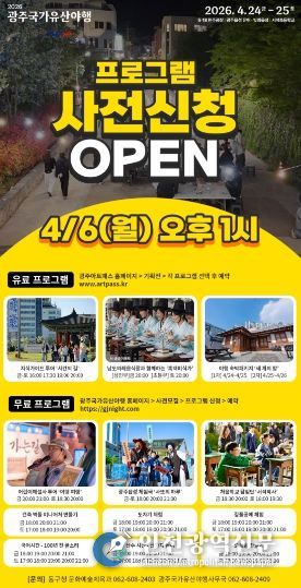 [인천광역신문] 최예준 기자 | 광주 동구는 오는 24~25일 이틀간 5·18민주광장, 서석초등학교, 광주읍성 유허 등 국가유산 일원에서 열리는 ‘광주 국가유산 야행’ 프로그램의 사전 참여자를 모집한다고 밝혔다.