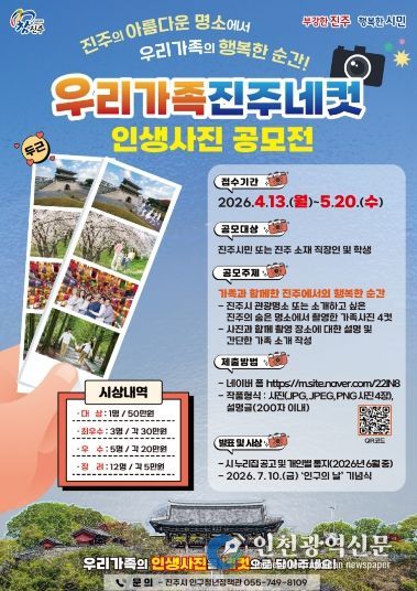 [인천광역신문] 최예준 기자 | 진주시는 가족과 함께한 일상 속 행복한 순간을 공유하고 가족 친화적 가치를 확산하며 지역에 대한 애향심을 높이기 위해 2026년 인구정책 '우리 가족 진주 네 컷' 인생사진 공모전을 개최한다.