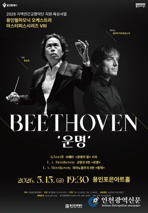 [인천광역신문] 최예준 기자 | 용인문화재단은 오는 5월 15일 오후 7시 30분 용인포은아트홀에서 ‘2026년 지역민간교향악단 지원·육성사업’의 첫 공연으로 용인필하모닉오케스트라의 기획공연 '마스터피스 시리즈 Ⅷ - 베토벤 ‘운명’'을 선보인다.