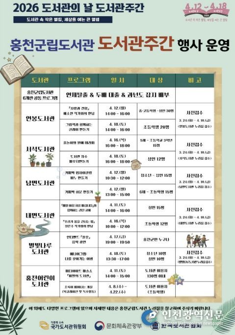 [인천광역신문] 최예준 기자 | 홍천 군립 도서관은 2026년 도서관의 날(4월 12일)과 도서관 주간(4월 12일~18일)을 기념해, 4월 한 달간 군민들을 위한 다채로운 독서 문화 프로그램을 운영한다.